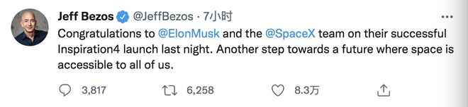9 月 17 日消息,當地時(shí)間周四亞馬遜創(chuàng )始人、太空公司藍色起源老板杰夫·貝索斯(Jeff Bezos)發(fā)推祝賀埃隆·馬斯克和 SpaceX 的“靈感 4 號”載人航天任務(wù)順利升空。他說(shuō),“祝賀埃隆·馬斯克和他的團隊昨晚成功發(fā)射’靈感 4 號’。”“我們朝著(zhù)所有人都能進(jìn)入太空的未來(lái)又邁出一步。”