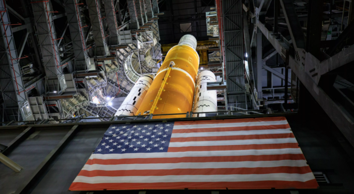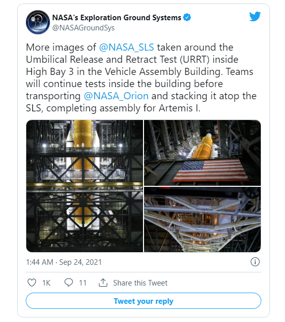 新的圖像來(lái)自于 NASA 在寬敞的裝配大樓內進(jìn)行的臍帶塔脫離和縮回測試 (URRT) 測試。