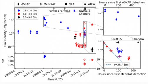 然后,他們嘗試用南非的更敏感的 MeerKAT 射電望遠鏡。由于信號是斷斷續續的,他們每隔幾周就觀(guān)察它 15 分鐘,希望能再次看到它。幸運的是,信號又回來(lái)了,但是信號源的行為現在有了很大的不同。這個(gè)信號源在一天之內就消失了,盡管它在天文學(xué)家以前的 ASKAP 觀(guān)測中已經(jīng)持續了數周。