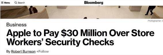 打了八年官司,美國蘋(píng)果公司終于同意向加州門(mén)店員工支付 2990 萬(wàn)美元,作為和解補償。據彭博社 13 日報道,加州蘋(píng)果商店員工于 2013 年對蘋(píng)果公司提起集體訴訟,理由是這些員工在工作或下班期間被迫接受公司的背包檢查,蘋(píng)果公司卻未就此進(jìn)行賠償,這違反了加州法律。