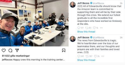 有人在推文中說(shuō),“貝索斯真可恥!!他今天還在西德克薩斯!他的員工卻失去了生命!”