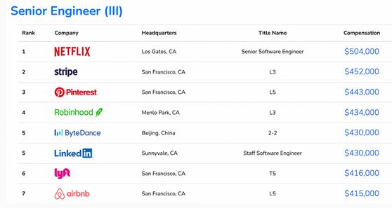 在高級工程師中,流媒體播放平臺 Netflix、支付巨頭 Stripe、社交平臺 Pinterest 位居前三,中位數薪資分別為 50.4 萬(wàn)美元、45.2 萬(wàn)美元、44.3 萬(wàn)美元。