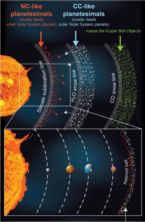 模擬顯示,固體顆粒蒸發(fā)成氣體時(shí)(被稱(chēng)為升華線(xiàn))可能會(huì )產(chǎn)生三個(gè)不同的區域。在離太陽(yáng)最近(或最熱)的區域,固體硅酸鹽變成了氣體;在中間區域,冰被加熱到足以變成氣體的程度;在最遠的區域,一氧化碳變成了氣體。