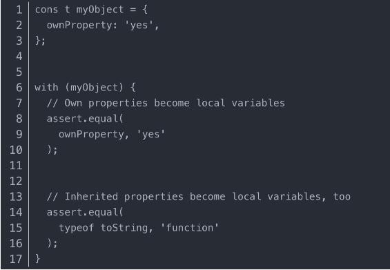 長(cháng)期以來(lái),人們一直不鼓勵使用 JavaScript 的 with 語(yǔ)句,甚至在 ES5 中引入的嚴格模式中也被定為非法。在其他地方,嚴格模式在 ECMAScript 模塊中是活躍的。