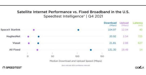星鏈衛星的分布式特性使其能夠以比傳統衛星互聯(lián)網(wǎng)更快的速度、更低的延遲提供服務(wù)。Ookla 將星鏈與 HughesNet 和 Viasat 進(jìn)行了對比,后兩者在星鏈之前瓜分了衛星互聯(lián)網(wǎng)市場(chǎng)。HughesNet 和 Viasat 的平均下載速度約為 20Mbps,上傳速度為 2-3Mbps。
