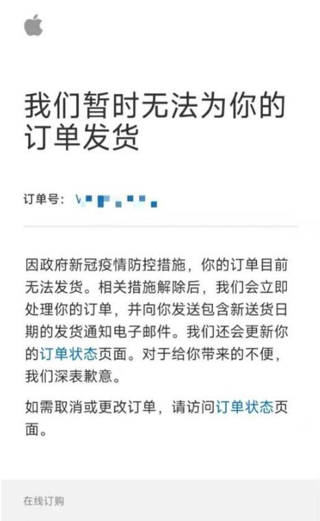 蘋(píng)果表示,“ 因政府新冠疫情防控措施,你的訂單目前無(wú)法發(fā)貨。相關(guān)措施解除后,我們會(huì )立即處理你的訂單,并向你發(fā)送包含新送貨日期的發(fā)貨通知電子郵件。我們還會(huì )更新你的訂單狀態(tài)頁(yè)面。對于給你帶來(lái)的不便,我們深表歉意。如需取消或更改訂單,請訪(fǎng)問(wèn)訂單狀態(tài)頁(yè)面。”