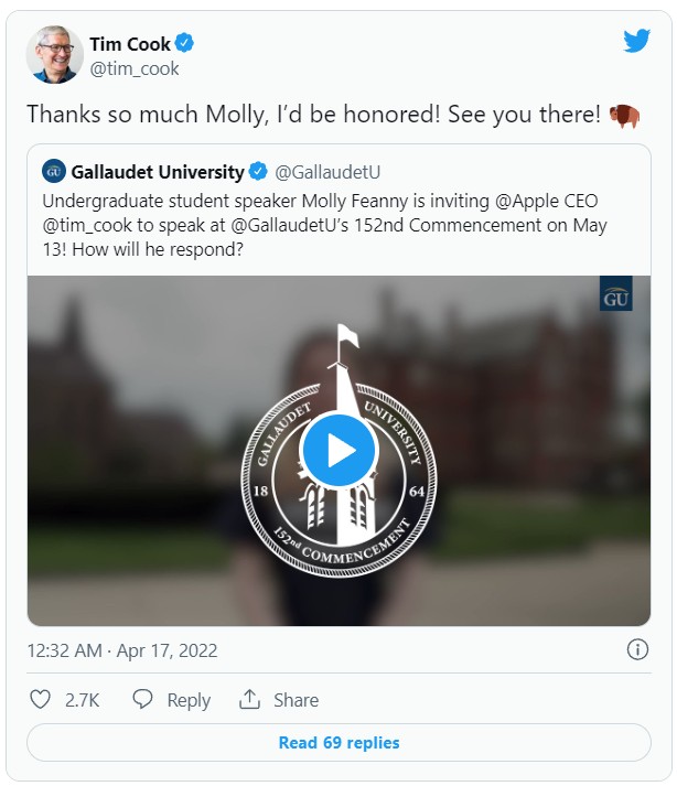 該邀請視頻大約 1 分多鐘,范尼使用美國手語(yǔ),并配有字幕和配音。費恩尼稱(chēng)庫克是“一位了不起的遠見(jiàn)卓識和領(lǐng)導者”,并說(shuō)大學(xué)“很榮幸能邀請您來(lái)這里為我們演講”。