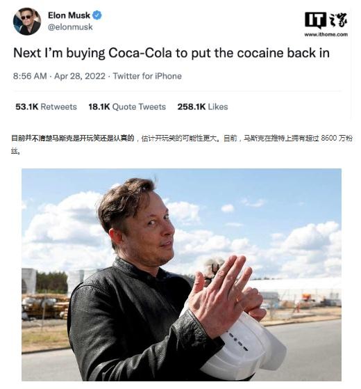 北京時(shí)間 28 日 8 點(diǎn) 56 分,馬斯克發(fā)推文稱(chēng),“接下來(lái)我要收購可口可樂(lè )公司,再把可卡因重新加進(jìn)去。”