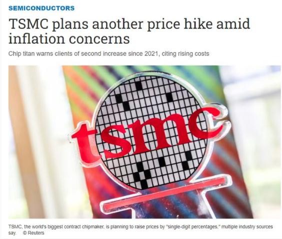 5 月 10 日,日經(jīng)亞洲援引知情人士的話(huà)報道稱(chēng),臺積電正計劃再次對晶圓代工業(yè)務(wù)實(shí)施漲價(jià),目前已開(kāi)始向客戶(hù)發(fā)出通知,理由是通脹壓力導致零部件、原材料和運費等生產(chǎn)成本上升,同時(shí)要確保大規模擴張產(chǎn)能所用的資金。