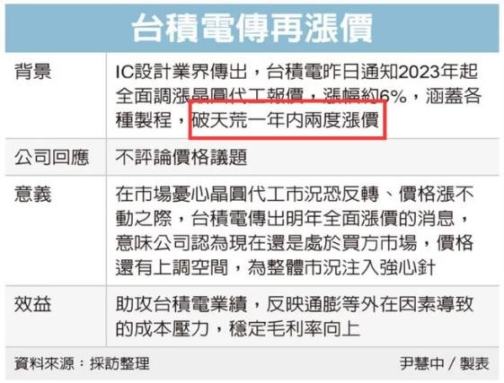 臺積電作為全球晶圓代工龍頭,過(guò)去以“很少漲價(jià)”著(zhù)稱(chēng)。但在全球通貨膨脹、大規模擴產(chǎn)需要巨額資金等壓力下,該公司日前再度通知客戶(hù)將提高所有制程的價(jià)格。這也是臺積電在一年內第二次提價(jià),讓日媒“震驚”、臺媒直呼“破天荒”,同時(shí)也讓業(yè)內感到不安。