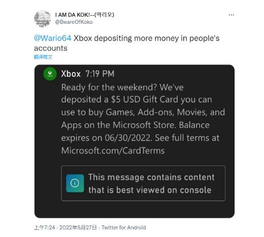 根據玩家從 Xbox 上收到的消息,這些 5 美元的禮品卡將持續到 6 月 30 日,但這條消息不太容易被發(fā)覺(jué)到。