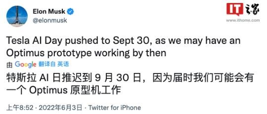 特斯拉 CEO 埃隆?馬斯克在推特發(fā)文稱(chēng),第二屆特斯拉 AI 日(人工智能日)活動(dòng)推遲到 9 月 30 日,屆時(shí)可能會(huì )有一臺人形機器人擎天柱(Optimus)原型機運行。
