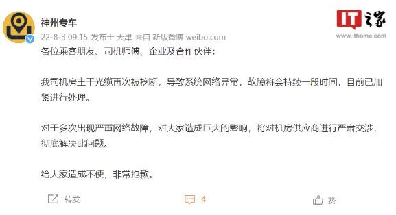 今日上午,神州專(zhuān)車(chē)發(fā)布公告稱(chēng),公司機房主干光纜再次被挖斷,導致系統網(wǎng)絡(luò )異常,故障將會(huì )持續一段時(shí)間,目前已加緊進(jìn)行處理。