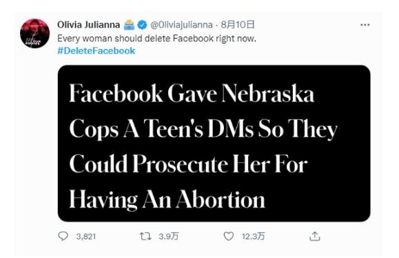 此前,Facebook 因其向內布拉斯加州警方提供了墮胎當事人的臉書(shū)消息和相關(guān)活動(dòng),遭到了網(wǎng)友的強烈反對,#刪除臉書(shū)#(DeleteFacebook)這一話(huà)題登上了事發(fā)當日的美國推特熱榜。