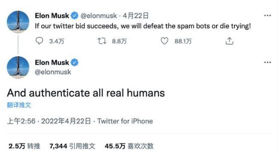 推特平臺的虛假賬戶(hù)一直是馬斯克的“心頭大患”。在推特同意被收購之前,馬斯克就曾大張旗鼓地表示,想在推特推行實(shí)名制。4 月 22 日他發(fā)布推文稱(chēng),“如果能夠成功收購推特,將打擊所有的機器人賬號,驗證所有的真人賬號。”