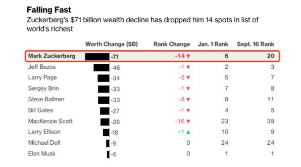 盡管幾乎所有美國科技巨頭都經(jīng)歷了艱難的一年,但是扎克伯格的財富大縮水依然引人注目。今年到目前為止,他的財富縮水了一半還多,達到了 710 億美元 (約合 4975 億元人民幣),是彭博億萬(wàn)富翁指數追蹤的超級富豪中損失最多的。他目前的凈資產(chǎn)為 559 億美元,在全球億萬(wàn)富翁中的排名從年初的第第 6 下滑至第 20 位,這是他自 2014 年以來(lái)的最低排名,處于三個(gè)沃爾頓家族和兩個(gè)科赫家族成員之后。
