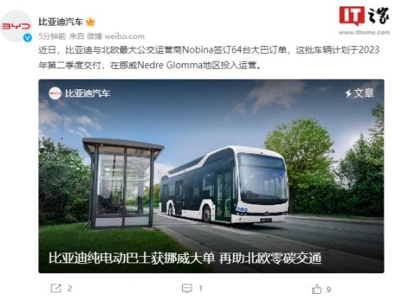 據比亞迪官微,近日,比亞迪與北歐最大公交運營(yíng)商 Nobina 簽訂 64 臺大巴訂單,這批車(chē)輛計劃于 2023 年第二季度交付,在挪威 Nedre Glomma 地區投入運營(yíng)。