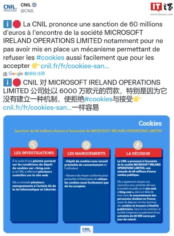 法國國家數據保護委員會(huì ) (CNIL) 周四表示,已對微軟愛(ài)爾蘭公司處以 6000 萬(wàn)歐元(約 4.45 億元人民幣)罰款,因為該公司沒(méi)有建立一種機制,讓人們像接受 Cookie 一樣容易地拒絕 Cookie。