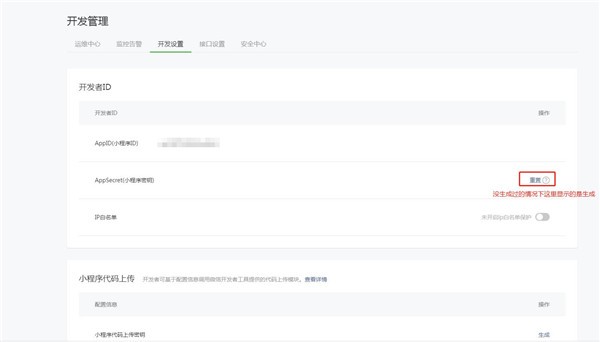 3.到設置頁(yè)面后我們可以看到第一個(gè)是AppID(小程序ID),這個(gè)參數是自帶的,無(wú)需生成,然后下面的AppSecret(小程序密鑰)是需要自己生成的,這兩個(gè)參數很重要?;緦尤魏螙|西都需要。AppSecret沒(méi)有生成過(guò)的情況下會(huì )顯示生成,如果已經(jīng)生成過(guò)了會(huì )顯示重置。