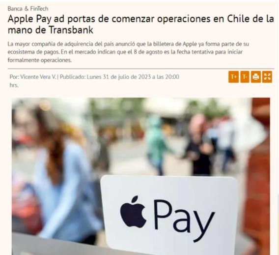 據智利金融報紙《Diario Financeiro》報道,智利銀行業(yè)巨頭 Transbank 在社交媒體上分享了一篇帖子:歡迎 Apple Pay 進(jìn)入該國。盡管該帖子后來(lái)被刪除,但記者 Pedro Martín 獨立向“至少四個(gè)來(lái)自金融機構的消息來(lái)源”證實(shí),Apple Pay 定于 8 月 8 日在智利正式推出。