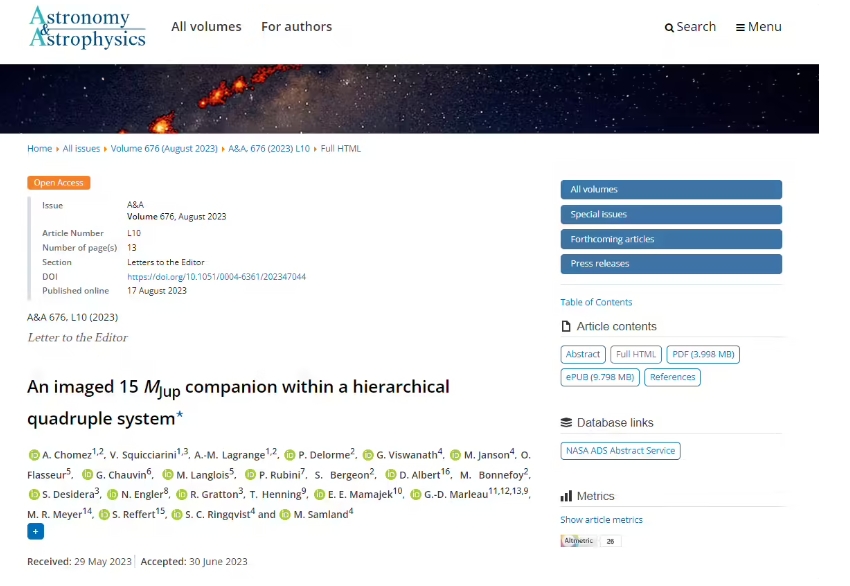研究人員指出:“事實(shí)上,這是首個(gè)使用直接成像技術(shù)發(fā)現的分層四重系統,這對于了解像這樣的復雜恒星系統是如何形成和演化的屬于是無(wú)價(jià)之寶。”
