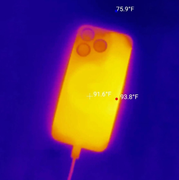 而在升級 iOS 17.0.3 系統之后,iPhone 15 Pro 和 iPhone 15 Pro Max 在充電狀態(tài)下最高溫度為 93.8 華氏(34.3 攝氏度),溫度在 85-95 華氏之間。