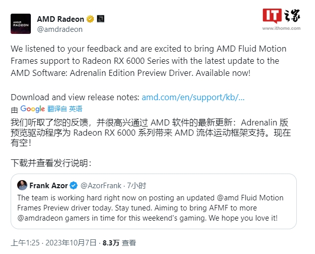 AMD 聽(tīng)取用戶(hù)反饋,為 RX 6000 系列顯卡帶來(lái) AFMF 幀生成技術(shù)支持
