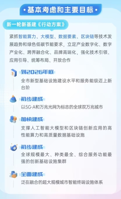 到 2026 年底,全市新型基礎設施建設水平和服務(wù)能級邁上新臺階,人工智能、區塊鏈、第五代移動(dòng)通信(5G)、數字孿生等新技術(shù)更加廣泛融入和改變城市生產(chǎn)生活,支撐國際數字之都建設的新型基礎設施框架體系基本建成。
