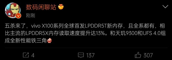 此外,博主 @數碼閑聊站 也放出了同樣的消息,并稱(chēng) vivo X100 系列全系搭載 LPDDR5T 內存,和天璣 9300 和 UFS4.0 組成全新性能鐵三角。