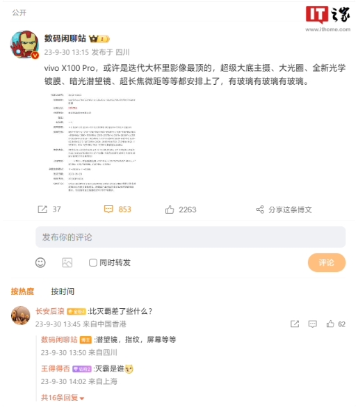 博主 @數碼閑聊站 此前還稱(chēng) vivo X100 Pro 影像方面“或為迭代大杯機型最頂”,配有超級大底主攝、大光圈、全新光學(xué)鍍膜、暗光潛望鏡、超長(cháng)焦微距等等,并強調該機“有玻璃”。