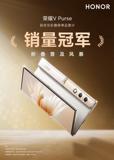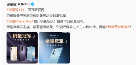 11月1日,榮耀官方戰報顯示,榮耀折疊屏手機取得雙十一“開(kāi)門(mén)紅”:榮耀Magic Vs2斬獲京東&天貓雙平臺折疊屏單品銷(xiāo)量冠軍,榮耀V Purse斬獲京東折疊屏單品累計銷(xiāo)量冠軍,榮耀折疊屏家族斬獲折疊屏品類(lèi)銷(xiāo)量冠軍。