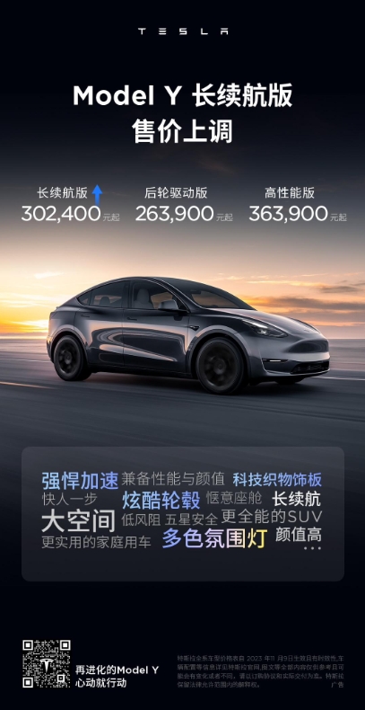 Model Y 全輪驅動(dòng)長(cháng)續航版售價(jià)調整為 30.24 萬(wàn)元,此前為 29.99 萬(wàn)元,上漲 2500 元。