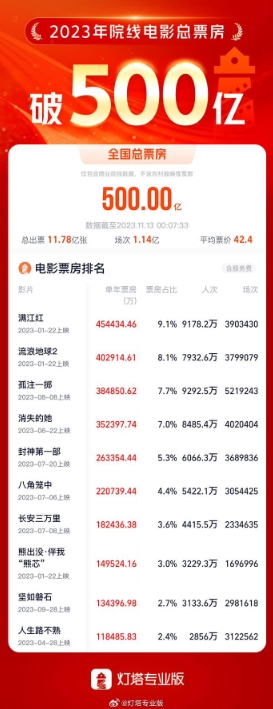 中國 2023 年度電影總票房突破 500 億,國產(chǎn)片占 83.4%