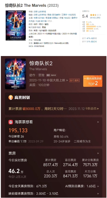 值得一提的是,近期上映的漫威新片《驚奇隊長(cháng) 2》票房突破 8000 萬(wàn),首日票房 2714.4 萬(wàn)。截至發(fā)稿,該片豆瓣評分 5.4 分,3 星評價(jià)占 42.8%。