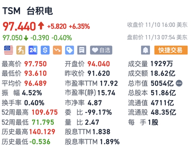 分析師認為這也可以看出全球芯片市場(chǎng)似乎正逐漸從低谷中復蘇。受此消息提振,臺積電美股上周五收漲6.35%,創(chuàng )下5月份以來(lái)的最大單日漲幅,今日美股盤(pán)前臺積電小幅下跌0.4%。