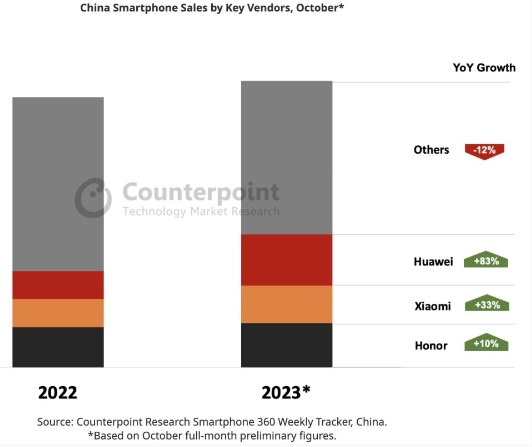 10月中國智能手機市場(chǎng)復蘇:華為銷(xiāo)量同比暴增83%,小米增33%
