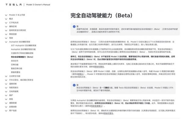 而就在這兩天,在特斯拉中國官網(wǎng)的車(chē)主手冊里,也出現了完全自動(dòng)駕駛能力(Beta)的功能的功能介紹。