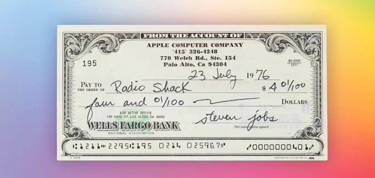 這張支票于 1976 年 7 月 23 日由喬布斯親筆簽名,采用蘋(píng)果公司特殊的 6*3 支票設計,由喬布斯支付給 Radio Shack,開(kāi)票金額為 4.01 美元。