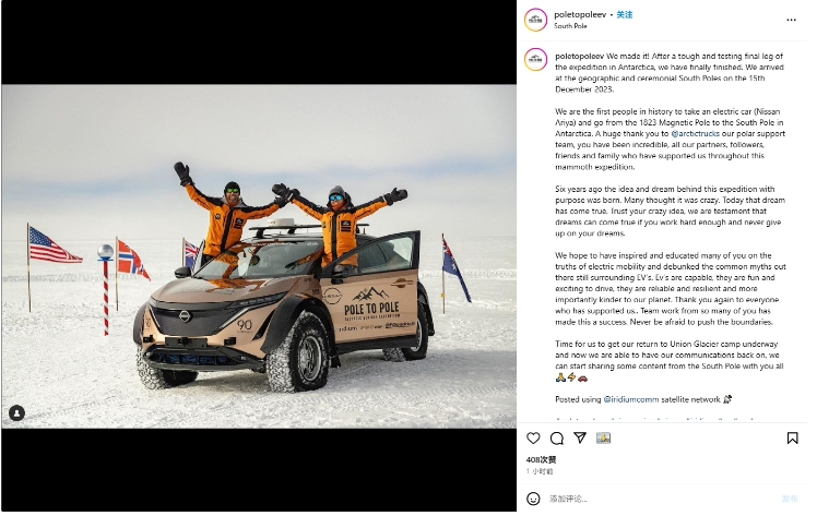 “Pole to Pole”(跨越極地)探險團隊北京時(shí)間今天早上發(fā)文宣布,今年 12 月 15 日,一對英國探險家夫婦于當地時(shí)間 12 月 15 日成功駕駛電動(dòng)汽車(chē)抵達南極洲,這是史上首輛跨越兩極的電動(dòng)汽車(chē)乃至所有汽車(chē)。
