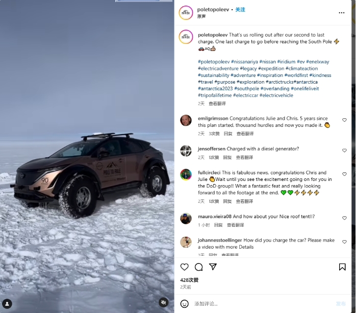 這對名為 Chris 和 Julie 的夫婦于今年 3 月從北極出發(fā),駕駛的車(chē)輛是日產(chǎn)旗下純電動(dòng) SUV 艾睿雅,不過(guò)這輛汽車(chē)經(jīng)過(guò)了冰島一家改裝車(chē)公司的改造,目的是將其作為未來(lái)電動(dòng)汽車(chē)改裝的概念驗證,最終希望能夠取代目前用于南極研究、科考所用的柴油汽車(chē)。