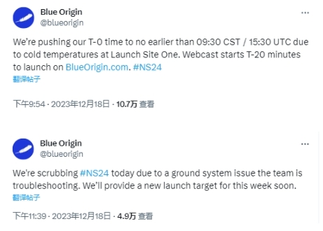 藍色起源公司(Blue Origin)宣布原定于周一進(jìn)行的發(fā)射活動(dòng),由于發(fā)射場(chǎng)的低溫、地面系統故障等因素延遲后取消,將在本周再次擇機進(jìn)行發(fā)射。