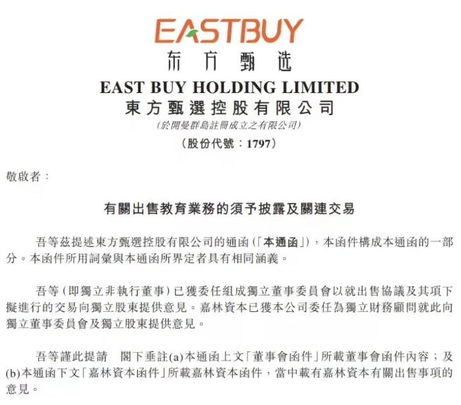 東方甄選公告稱(chēng):“出售事項乃廣義新東方集團業(yè)務(wù)重組的一部分,旨在更明確地劃分其業(yè)務(wù)線(xiàn),及更好地使其業(yè)務(wù)部門(mén)與運營(yíng)環(huán)境保持一致。目前,本集團及新東方集團所運營(yíng)的行業(yè)相互重疊,其業(yè)務(wù)根據其產(chǎn)品 / 服務(wù)的交付媒介進(jìn)行劃分。出售事項后,本集團及新東方集團所運營(yíng)的行業(yè)將相互區分且各不相同,本集團不再經(jīng)營(yíng)在線(xiàn)教育領(lǐng)域,而是成為一家專(zhuān)門(mén)的自營(yíng)產(chǎn)品及直播業(yè)務(wù)運營(yíng)商。”