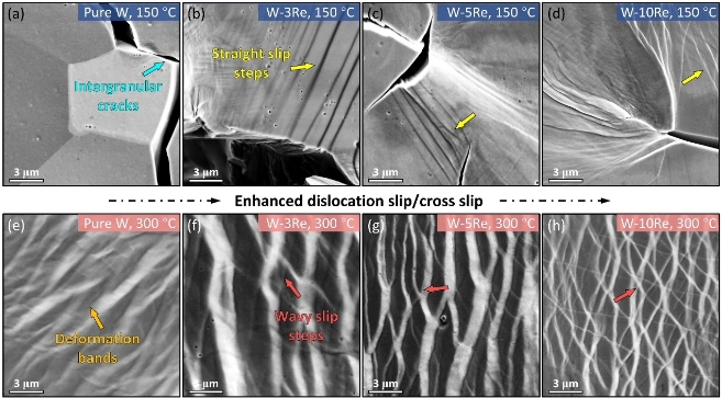 而且 Re 含量越高,W-Re 合金的韌脆轉變溫度越高(如圖 1 所示)。通過(guò)表面變形形貌的表征發(fā)現,相比于純 W 的沿晶開(kāi)裂,Re 合金化促進(jìn)了更多的位錯行為,從而增加了 W-Re 合金的低溫韌性,但這一改善非常有限。