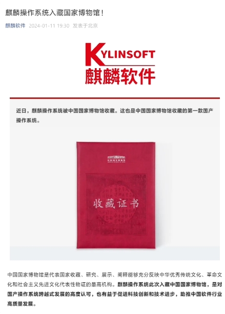 館藏首個(gè)國產(chǎn)操作系統:麒麟系統入藏中國國家博物館