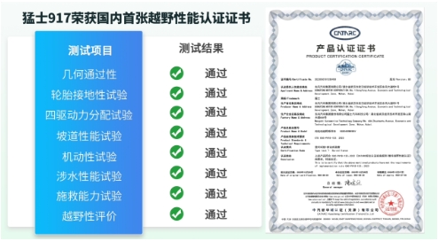東風(fēng)旗下猛士科技首款車(chē)型 —— 猛士 917 獲得中汽研華誠認證(天津)有限公司頒發(fā)的國內首張越野性能認證證書(shū)。