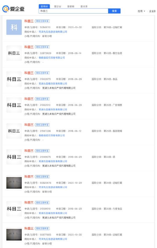 愛(ài)企查顯示:多家企業(yè)已申請“科目三”商標
