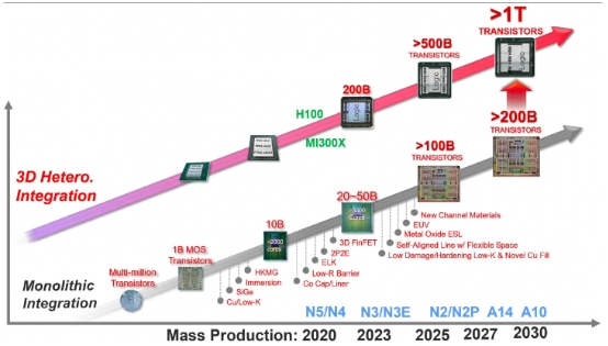此外,臺積電預計封裝技術(shù)(CoWoS、InFO、SoIC 等)將不斷取得進(jìn)步,使其能夠在 2030 年左右構建封裝超過(guò) 1 萬(wàn)億個(gè)晶體管的大規模多芯片解決方案。