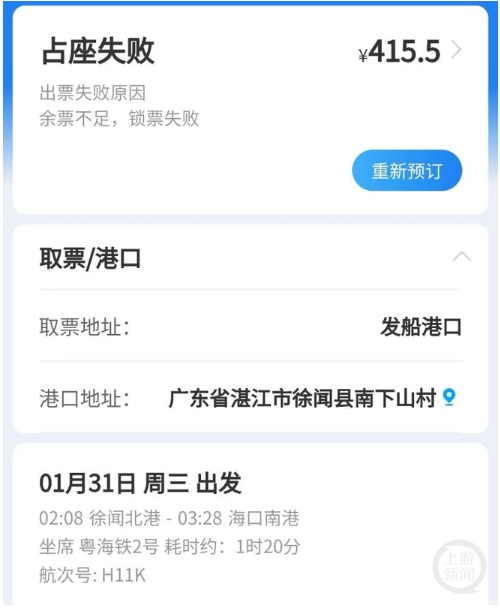 在"粵海鐵票務(wù)預訂"平臺,上游新聞?dòng)浾哌x擇徐聞北港至??谀细鄣?quot;小車(chē)及隨車(chē)人員"票,可以預訂的日期,截至2月3日,有多個(gè)班次的新能源車(chē)型票,但多次嘗試購票,系統均顯示:占座失敗,余票不足。而同一時(shí)期班次,燃油車(chē)則有余票。