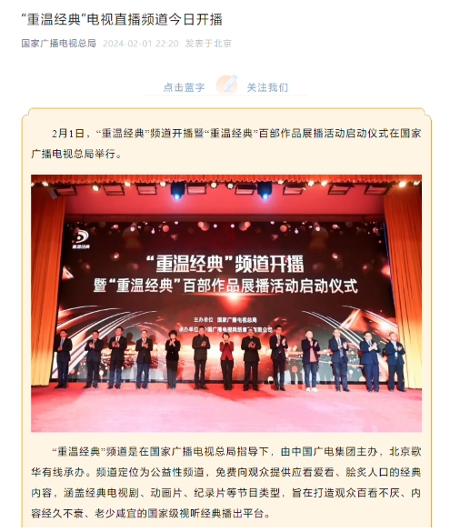 據國家廣播電視總局官方公眾號,“重溫經(jīng)典”頻道開(kāi)播暨“重溫經(jīng)典”百部作品展播活動(dòng)啟動(dòng)儀式,于今日在國家廣播電視總局舉行。