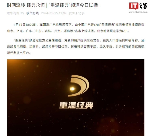 “重溫經(jīng)典”頻道于 1 月 15 日在北京、上海、廣東、山東、吉林、貴州、河北等 7 省市上線(xiàn)試播,北京地區頻道號為 618。
